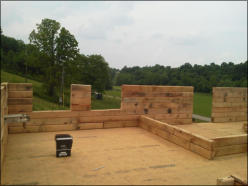 To anchor the first course, we run J-bolts through the sill plate into the foundation. After that, logs are stacked and secured